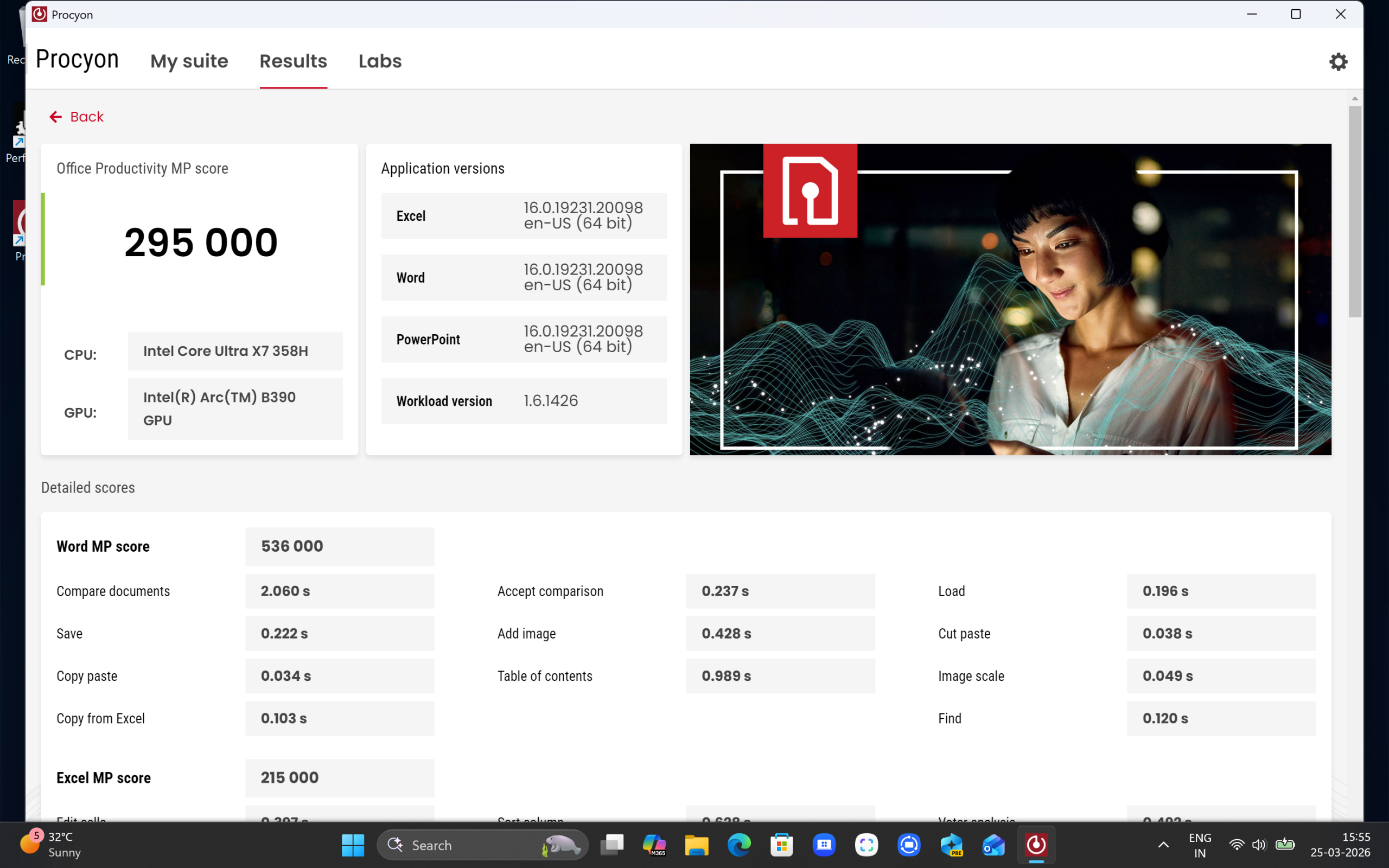 Similarly, in the UL Procyon Office Productivity multi-platform test, Intel leads with a score of 295,000, while the Ryzen AI 9 365 scores 267,000.