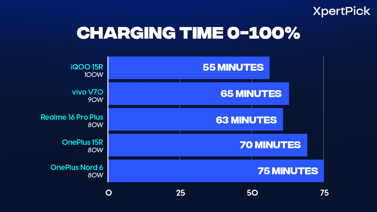 If charging speed is the priority, the iQOO 15R is clearly the best here. It is not just faster on paper, it actually saves meaningful time in real-world use. The OnePlus 15R comes closest due to its strong optimisation, but the gap remains. The rest fall into a more balanced or slower category depending on battery size and tuning.