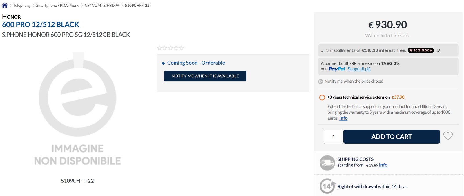 The Honor 600 Pro’s sole 12GB+512GB Black variant is listed for 930.90 euros. The standard 600 is also listed in a single Black shade.