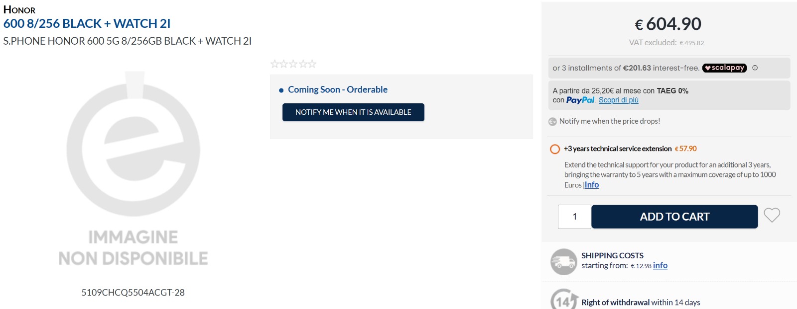 The above screenshots show that the Honor 600 variants, such as 8GB+256GB and 8GB+512GB, are priced at 604.90 euros and 651.89 euros, respectively, on the Italian retailer platform. Both variants include the Watch 2 as a free bundle.