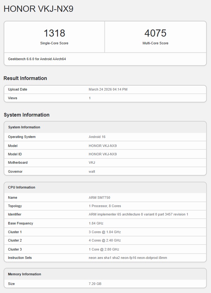 The Geekbench listing further states that the device has 8GB of RAM and Android 16, which is likely to have the MagicOS 10 skin on top. In the single-core and multi-core tests, the device recorded 1318 and 4075 points, respectively.