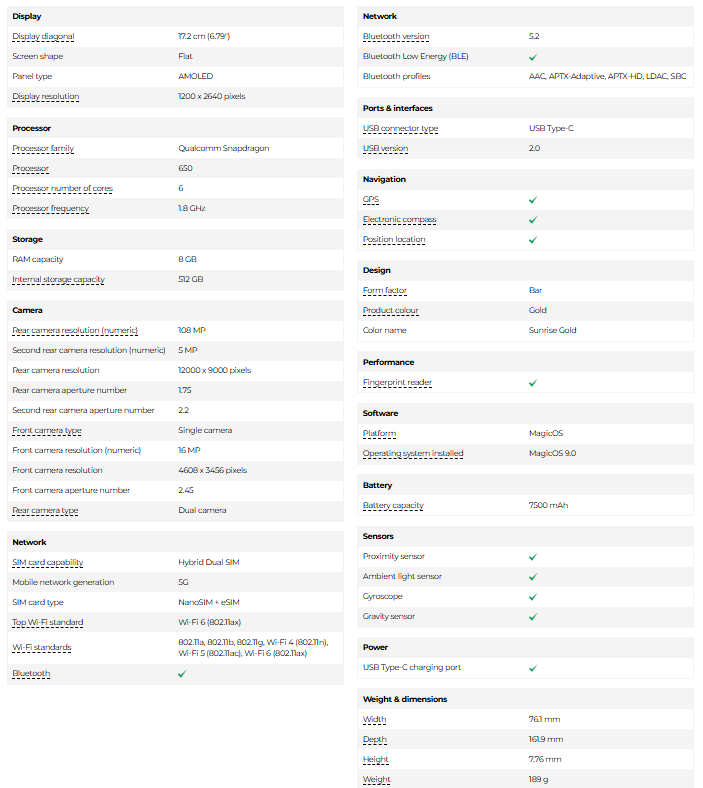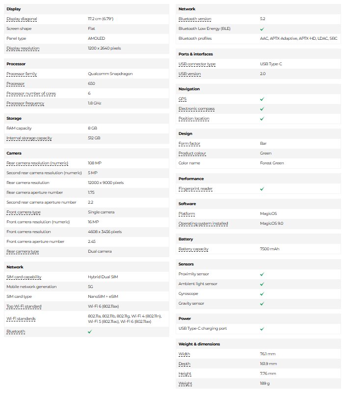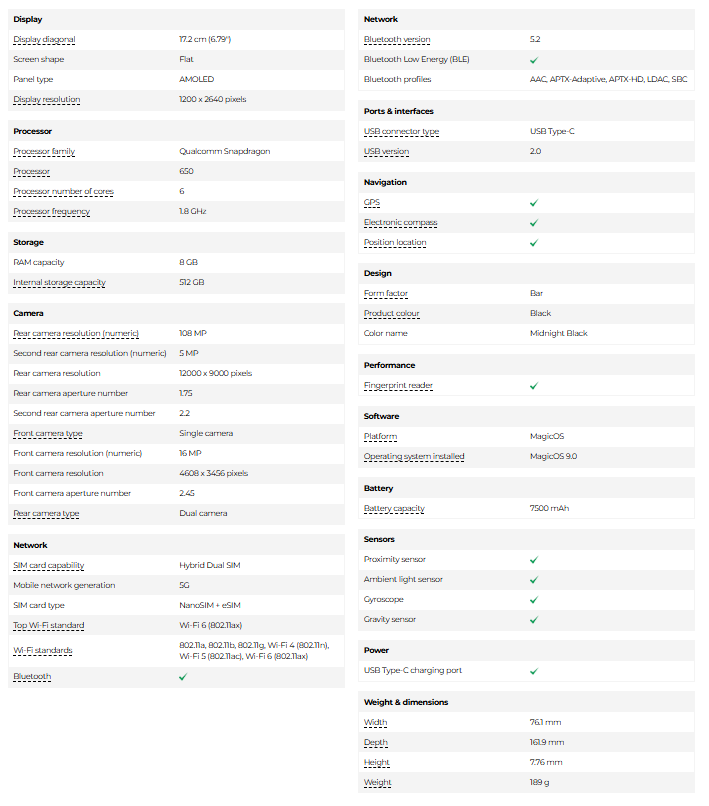 The Icecat listing reveals that the Honor Magic 8 Lite measures 161.9 x 76.1 x 7.76mm and weighs 189 grams. It has a 6.79-inch flat AMOLED screen that supports a 1.5K resolution of 1200 x 2640 pixels.