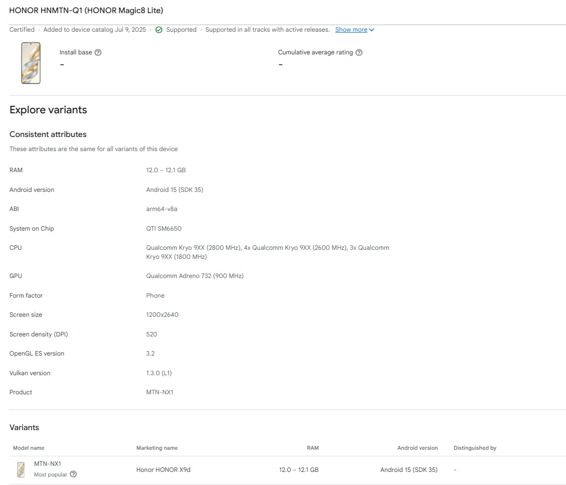 Readers can disregard the chipset configuration mentioned in the Play Console, which incorrectly points to the Snapdragon 7+ Gen 3. Multiple Geekbench listings also suggest that the device is powered by the Snapdragon 6 Gen 4. After all, the Magic 8 Lite is believed to be a tweaked version of the Snapdragon 6 Gen 4-powered Honor X9d available in some markets.