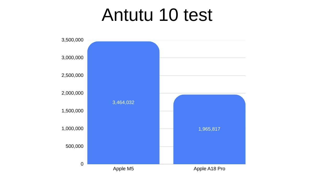 Starting with AnTuTu 10, which tests everything from graphics to memory speed, the M5 chip scored 3,464,087, while the A18 Pro scored 1,965,789, which represents roughly a 75% difference in score.