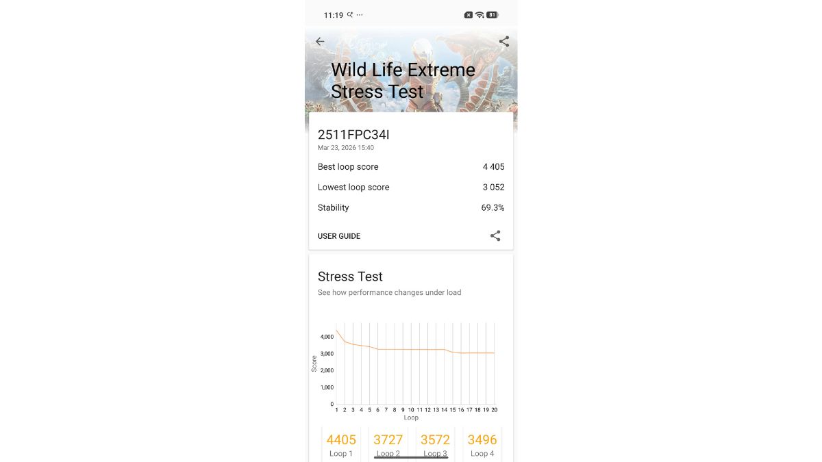 Next up are thermals, and here too the POCO X8 Pro performs really well, achieving 69.3% frame-rate stability in the 3DMark Wild Life Extreme stress test, while posting a best loop score of 4,232. Meanwhile, the Nothing Phone 4a scored an impressive 99.3% thermal stability. However, its performance is nearly half that of the X8 Pro, as it managed only 2,093.