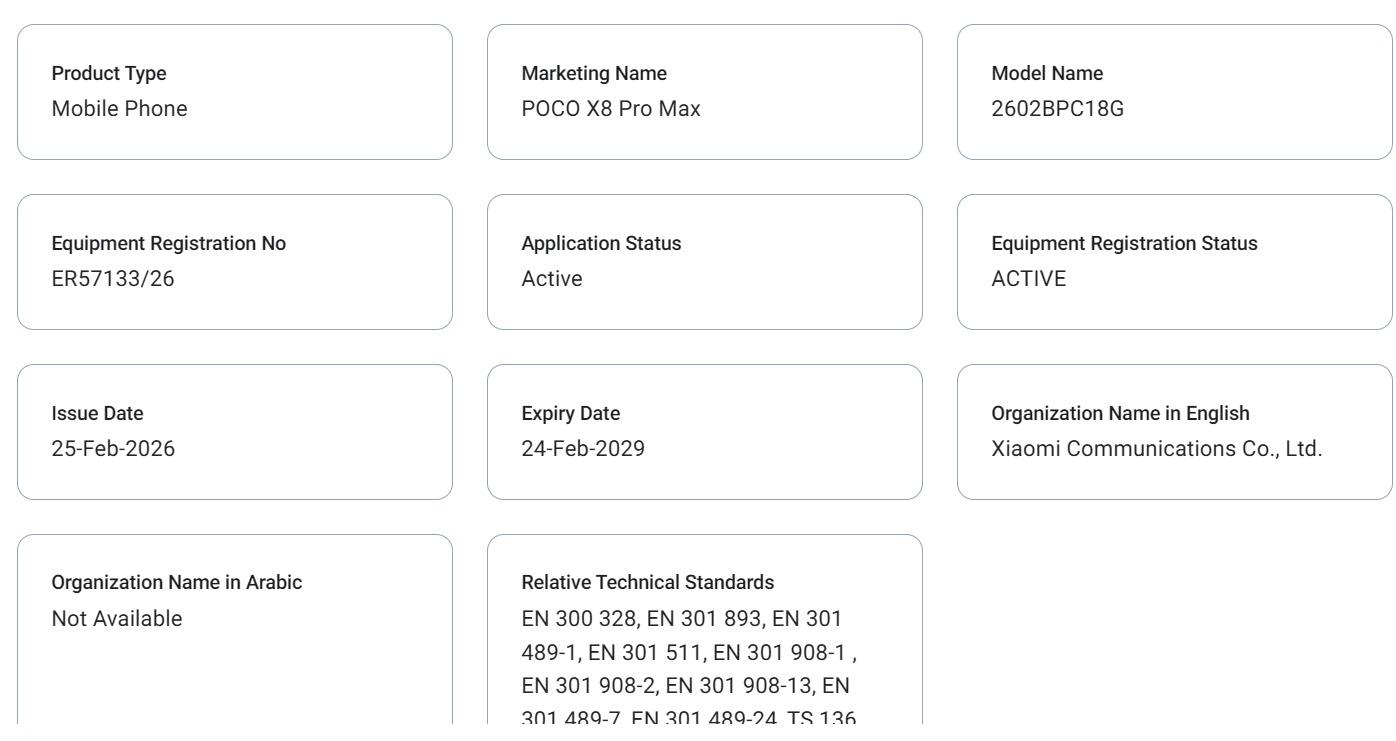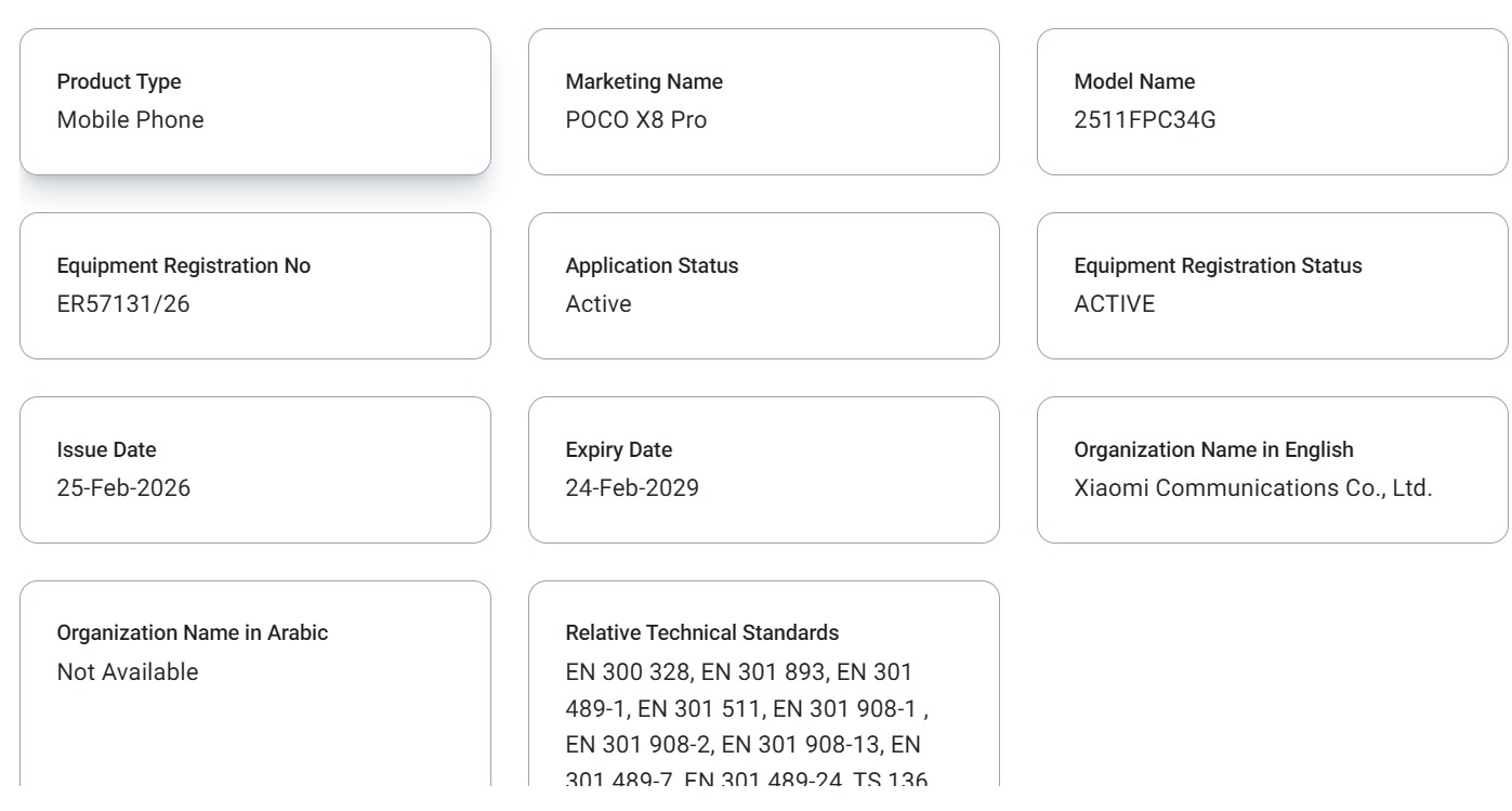 As can be seen above, the TDRA has approved two Poco phones with model numbers 2511FPC34G and 2602BPC18G. The listings have confirmed that these devices will be called the Poco X8 Pro and Poco X8 Pro Max, respectively, when they hit the market.