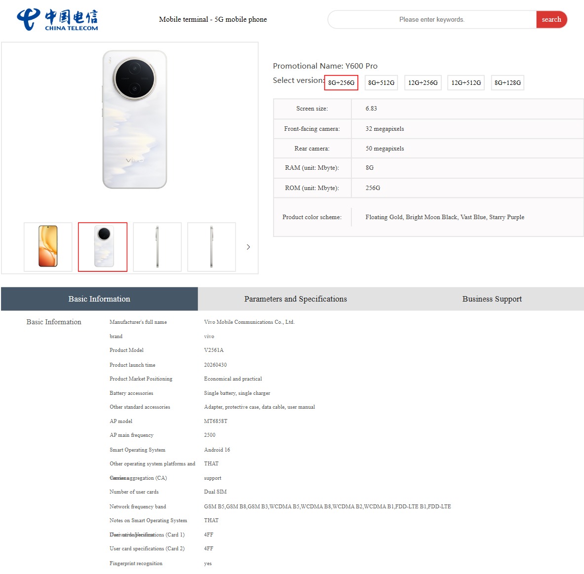 Despite having a huge battery inside, the Y600 Pro measures 163.90 × 76.50 × 8.15mm and weighs 221 grams. It will be available in multiple shades, including Floating Gold, Bright Moon Black, Vast Blue, and Starry Purple. The listing also reveals that it will hit the Chinese market on April 30.
